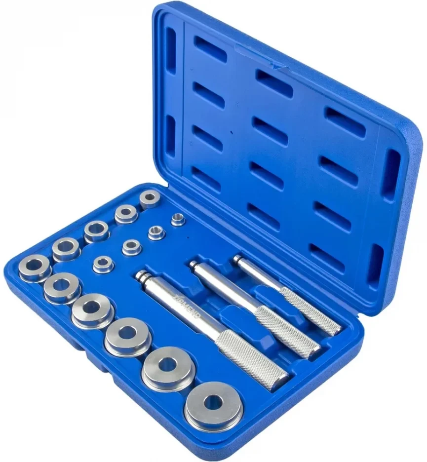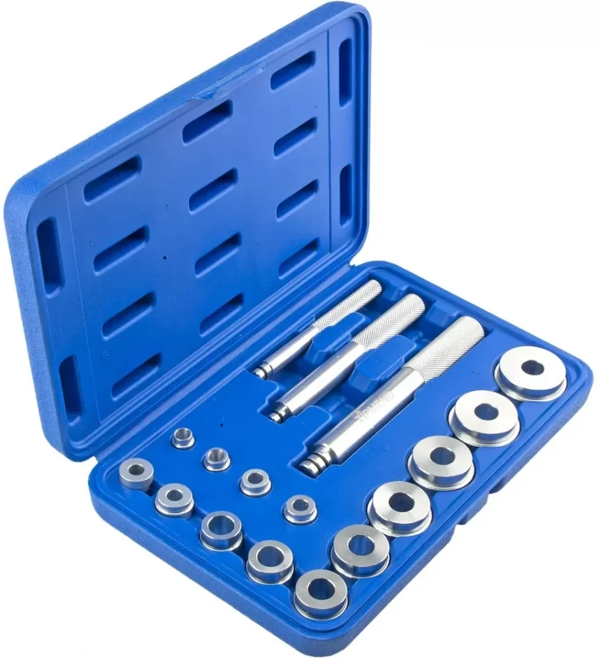 - Набор оправок для установки подшипников, сальников из 3-х рукояток и 13 оправок диаметром от 10 до 42 мм.