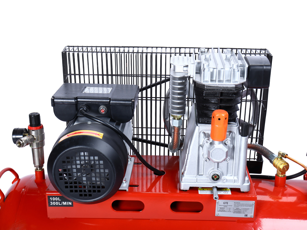 Компрессор поршневой с ременным приводом одноступенчатый 380 В, ресивер 100 л, 300 л/мин. \n \n \nОбъем ресивера: 100 л; \nСкорость холостого хода: 1050 об/мин; \nПотребляемая мощность: 3 кВт; \nНапряжени...