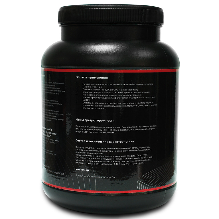 Удаляет нагар и мазут, лаковые, масложировые (смазочно-охлаждающие жидкости) и асфальтосмолопарафиновые отложения (АСПО) с различных элементов машиностроения из цветных и черных металлов, пластика, резины.