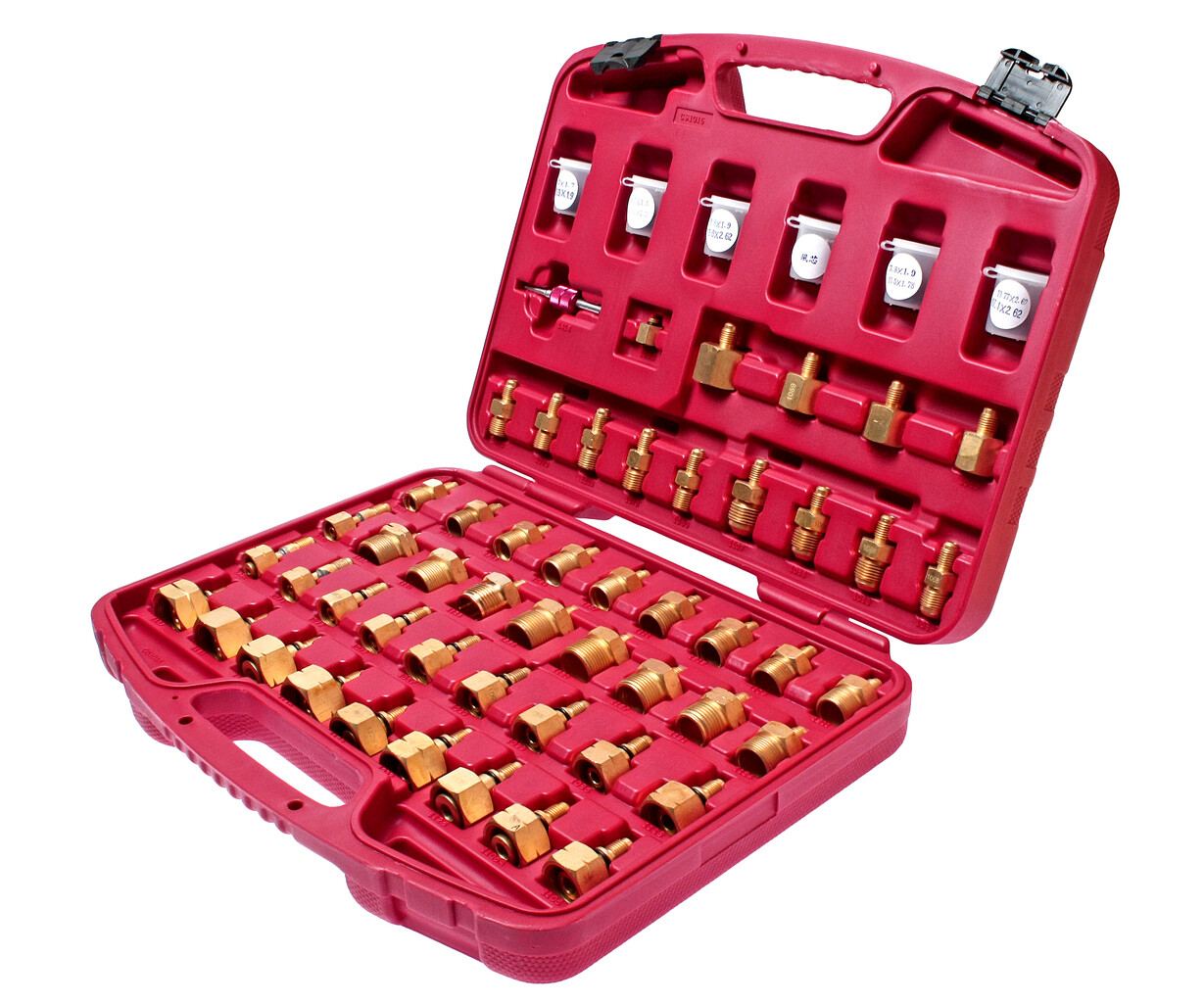 В набор входят различные адаптеры для тестирования системы кондиционирования на предмет утечек.