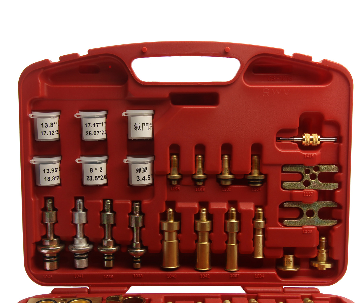 \n В набор входят различные адаптеры для тестирования системы кондиционирования на предмет утечек. \n Предназначен для проверки расширительного клапана, осушителя, компрессора, конденсатора, испарителя. \n Применение: автомобил...